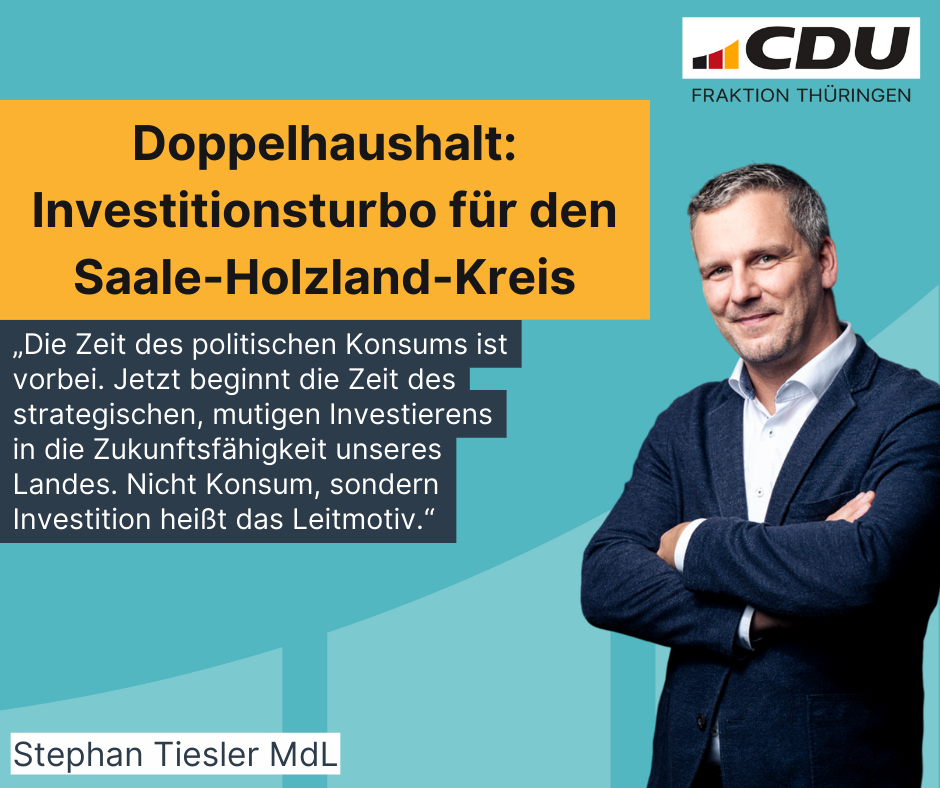 Der vorgelegte Haushalt bremse die konsumtiven Ausgaben und steigere die Investitionen auf einen Rekordwert in der Geschichte Thüringens, so Tiesler. Die CDU-Politiker: „Die Zeit des politischen Konsums ist vorbei. Jetzt beginnt die Zeit des strategischen, mutigen Investierens in die Zukunftsfähigkeit unseres Landes. Nicht Konsum, sondern Investition heißt das Leitmotiv.“ Als Beispiel nennen sie das kommunale Investitionsprogramm von einer Milliarde Euro, 100 Millionen Euro mehr bei Krankenhausinvestitionen, die kostenlose Meisterausbildung ab 1. Januar 2026, das Sonderprogramm für kleine Gemeinden oder eine Stärkung des Ehrenamts und des Unterstützerprogramms „Agathe“ für Ältere. Tiesler: „Wir kümmern uns um die Kernaufgaben des Staates, eine verlässliche Gesundheitsversorgung, Sicherheit im Alltag, starke Wirtschaft, gute Bildung und lebenswerte Städte und Gemeinden. Die kommenden Jahre sind für uns deshalb keine Atempause, sie sind eine Zeit des Aufbruchs, den auch die Menschen im Saale-Holzland-Kreis spüren werden.“