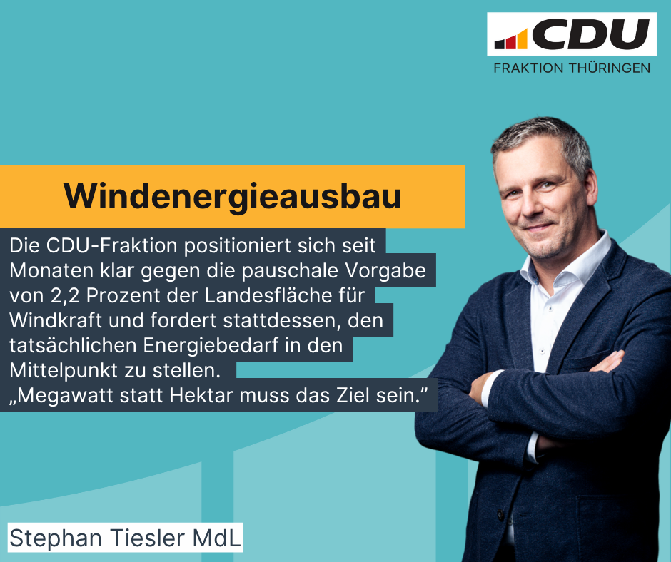 Die CDU-Fraktion positioniert sich seit Monaten klar gegen die pauschale Vorgabe von 2,2 Prozent der Landesfläche für Windkraft und fordert stattdessen, den tatsächlichen Energiebedarf in den Mittelpunkt zu stellen. „Megawatt statt Hektar muss das Ziel sein. Moderne, leistungsstarke Anlagen, mehr Repowering und ein kluger Energiemix über Photovoltaik, Biogas und Geothermie sind der richtige Weg“, so Tiesler.